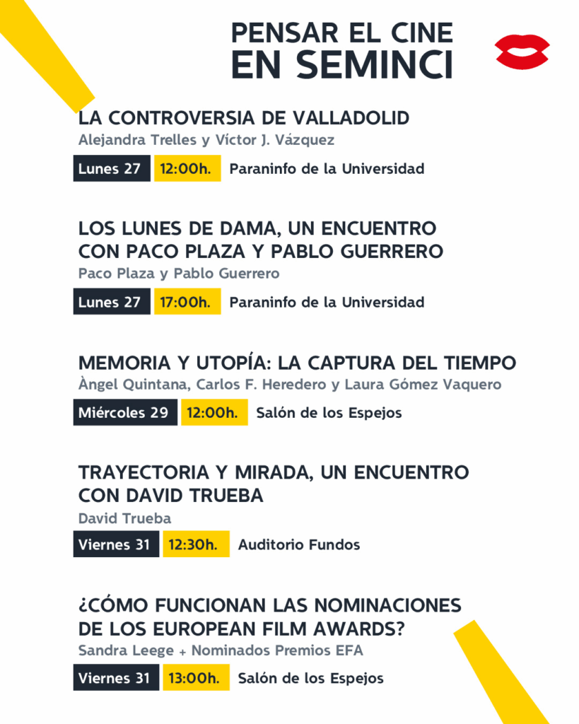 Los encuentros programados comenzarán el lunes 27 de octubre, a las 12 horas, en el Paraninfo de la Universidad de Valladolid con una conversación transatlántica sobre el 475 aniversario de La Controversia de Valladolid y los derechos humanos. Con la asistencia de Alejandra Trelles, directora artística de la Cinemateca Uruguaya,y el historiador Víctor J. Vázquez, y moderada por el filósofo José Manuel Chillón Lorenzo, complementa el ciclo programado en la 70ª edición.