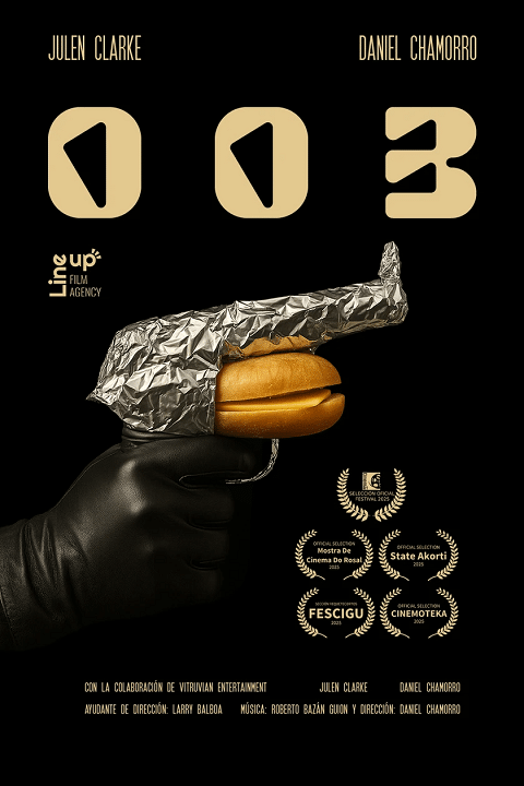 003, de Daniel Chamorro (3 min.), es una comedia breve y ágil que juega con los códigos del cine negro y el humor absurdo a través de una situación doméstica que deriva en malentendidos y giros surrealistas. El director y guionista, que cuenta con más de una docena de cortometrajes en su trayectoria, también protagoniza este trabajo.