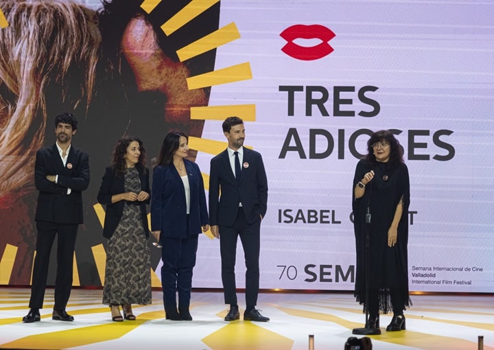 Next, the team behind the opening film, Three Goodbyes by Isabel Coixet, took to the stage at the Calderón Theatre. The Catalan director was accompanied by the cast, led by Francesco Carril, as well as producers Marisa Fernández Armenteros, Sandra Hermida and Álex Lafuente.